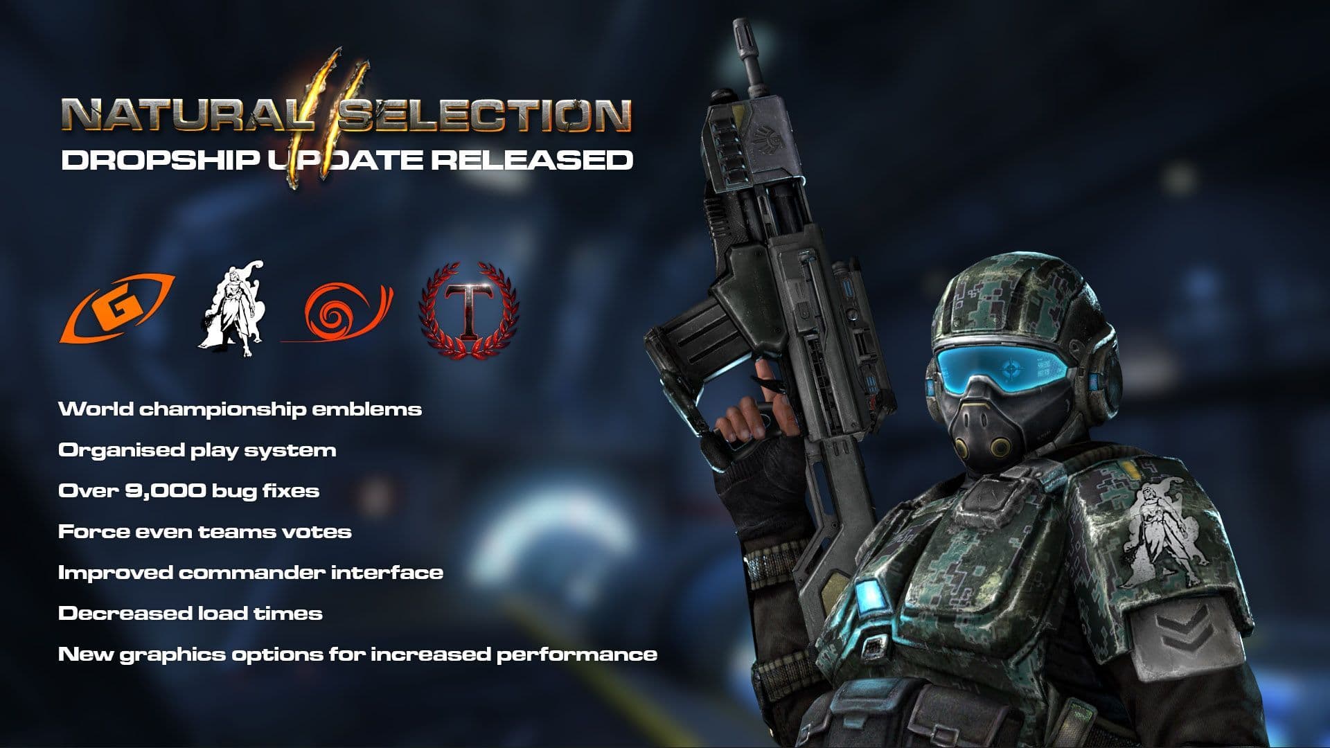 Natural Selection 2 Build 263 has been released, and we're calling it Dropship. This update adds a feature that Natural Selection 2 has deserved for a long time: Organised play. It also fixes a host of annoying issues, adds World Championship emblems, and includes lots of new small features that make play more enjoyable for all. httpv://www.youtube.com/watch?v=pTtr1fpDLb8& The update is the culmination of a collaboration between community volunteers, the World Championship organisers, and us here at Unknown Worlds. It is a big one!